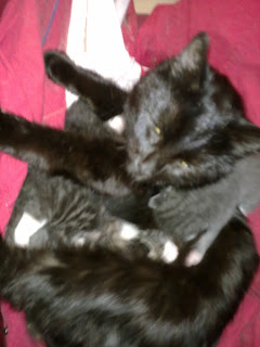 Aamulla rupesin laskemaan pentuja kun koppa näytti niin ahtaalta. summa summarum sain 9 pentua. ihmettelinkin miksi Pörrö kierti minua niin tarkkaan ja syy oli selvä. Olimme saaneet yli-innokkaan äiti-kissan. Maito oli kantanut Pörrönkin pennut omaan koppaan ja luuli ylpeänä voivansa imettää kaikkia 9 pentua. Kissalla huono matikkapää, eihän sillä ole nisiäkään niin paljon. Siispä jouduimme siirtämään Maidon pentuineen eri huoneeseen. Jospa se oppisi mitkä kuuluu sille.